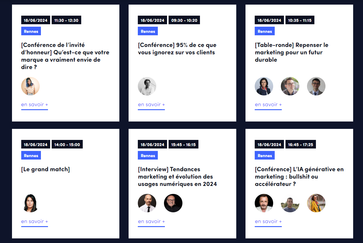 Avec plus de 900 participants, Intelligence Marketing Day est devenu le 1er événement Marketing digital & IA en France. Ce salon permet de rencontrer bon nombre de directeur(trice)s marketing du territoire. C’est une opportunité pour échanger, mais aussi pour faire votre veille sur une seule journée. Le programme propose 35 conférences animées par 50 speakers.