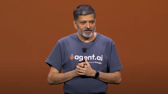Le cœur du discours de Dharmesh portait sur l'ascension fulgurante des agents IA. Et pour cause ! Le CTO arborait fièrement son t-shirt annuel, cette fois-ci frappé du logo "Agent.AI".