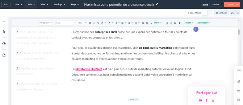 C’est pourquoi le logiciel HubSpot propose aussi un hub CMS (système de gestion de contenu) pour faciliter la création de contenus et l’optimisation du référencement naturel.